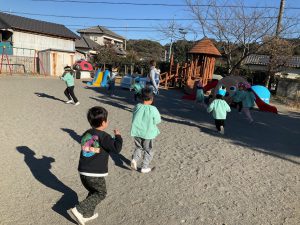 未満児さん達は 少し風が強く吹いていましたが 保育園の園庭で 自分の作ったお面をかぶり、